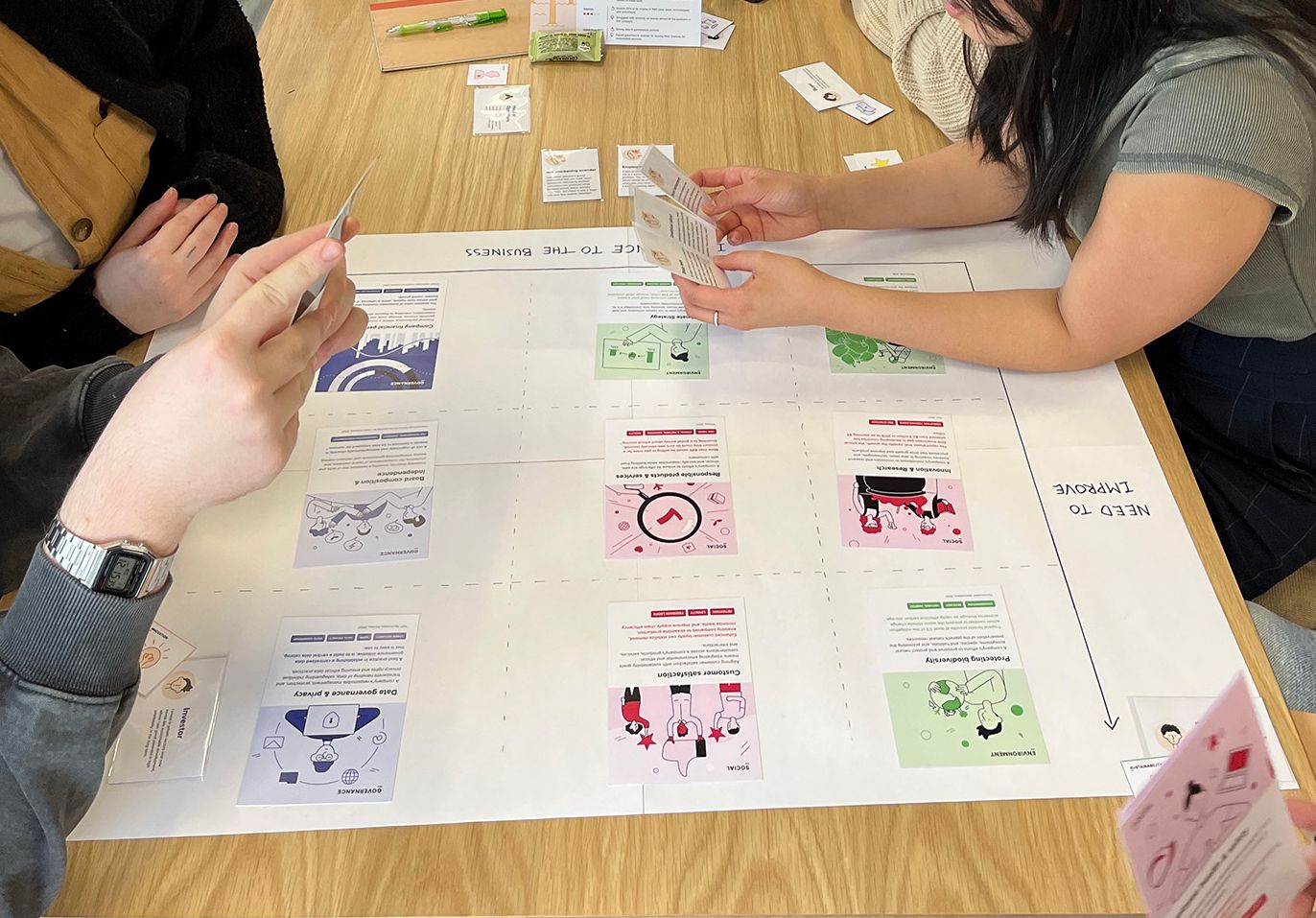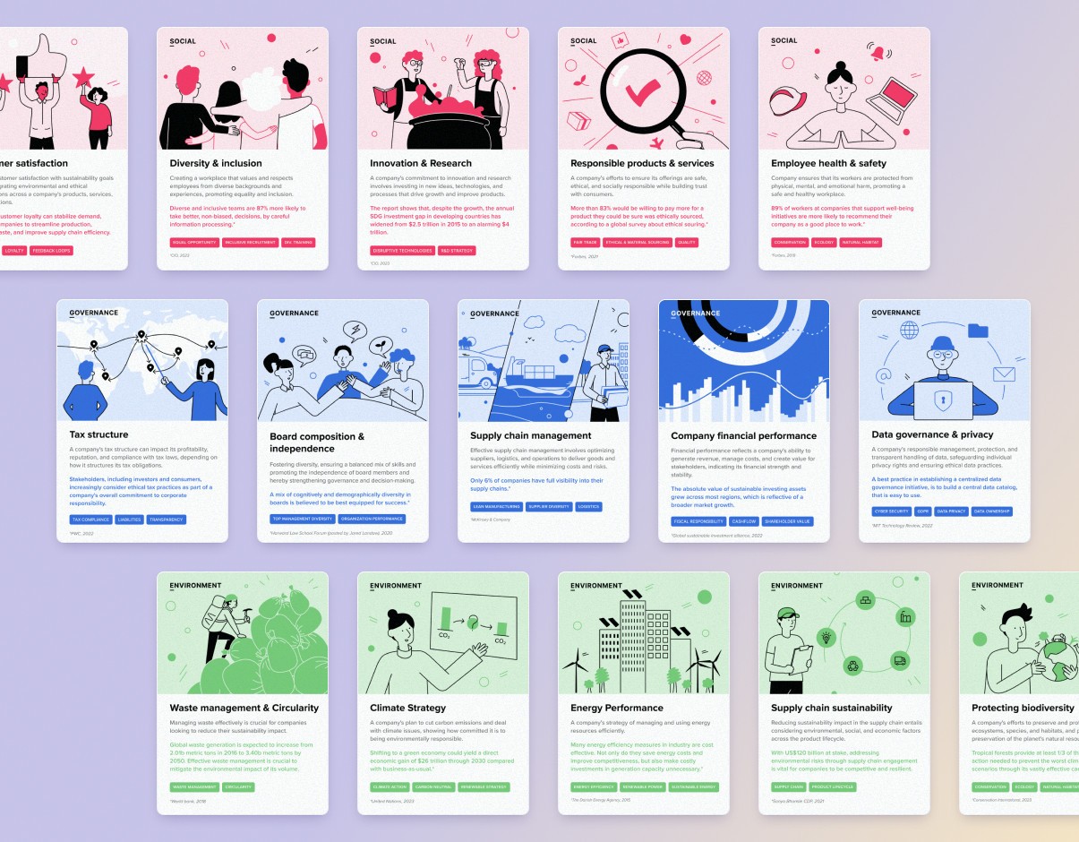 We've created a card game as a playful and educational way to introduce ESG factors to a company targeted by the regulation. The aim is to enable all employees to understand the main issues at stake and how to assess them, through a workshop facilitated by a designer using the card deck.